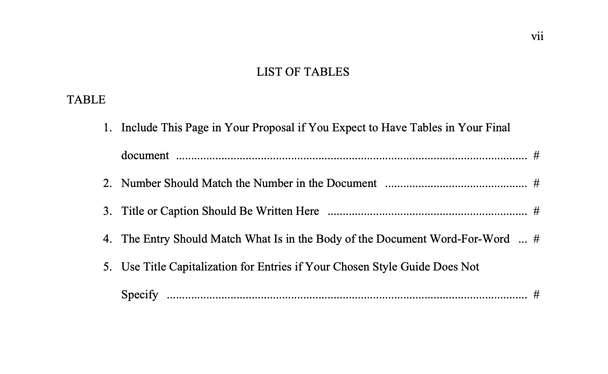 - Include only the first sentence of the title or caption (up to the first period) in the List of Tables or List of Figures. Parenthetical information may be excluded from the listings.