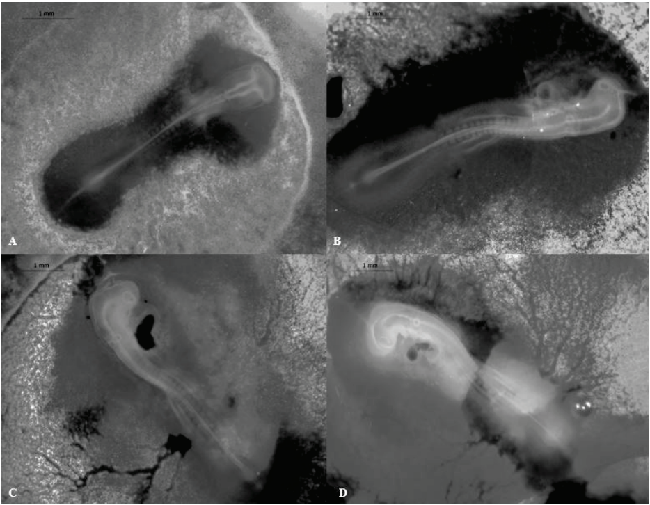 Figure 1. Stages 11–14 (52–60 h) of the California valley quail’s embryological development A) Stage 11, 13 somite pairs visible, B) Stage 12, 16 somite pairs visible. Telencephalon, optic vesicles, and auditory pit present, C) Stage 13, 19 somite pairs visible. Telencephalon and heart more prominent than previous stage, D) Stage 14, 22 somite pairs present. Optic lens, and Rathke's pouch can be identified.