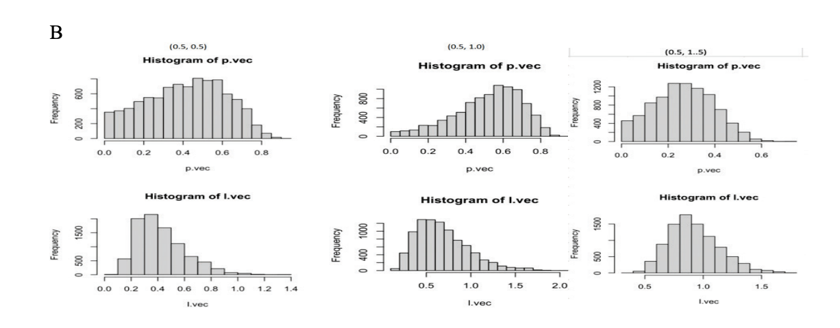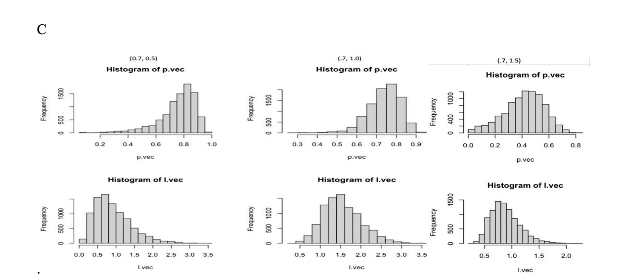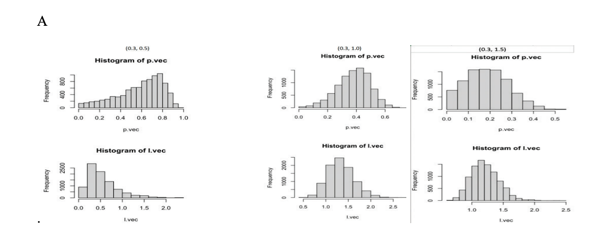 Note. A is a Histogram of P and λ Vectors Where p = 0.3 and λ = 0.5, B is a Histogram of P and λ Vectors Where p = 0.3 and λ = 1.0, and C is a Histogram of P and λ Vectors Where p = 0.3 and λ = 1.5.