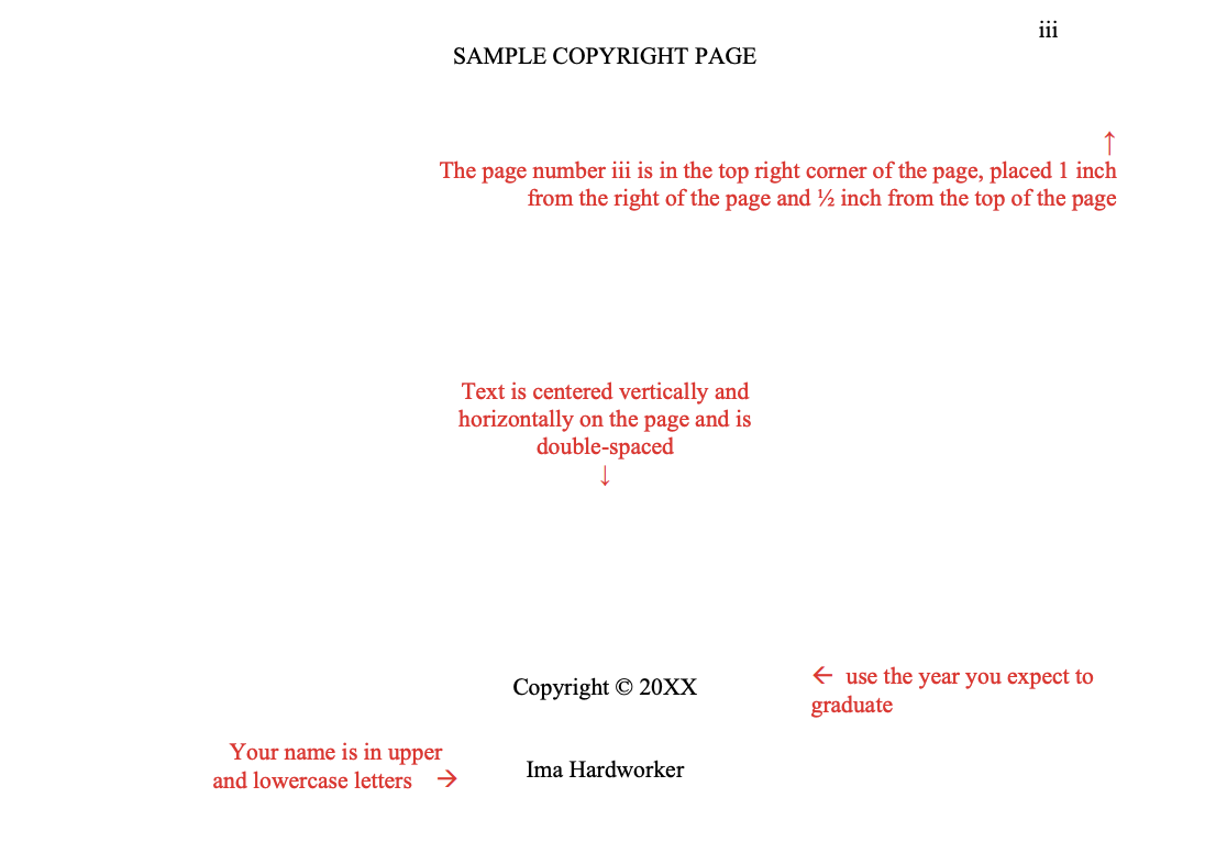 - Copyright page (if copyrighting, this will be the first page with a page number—Roman numeral iii in the top right corner)