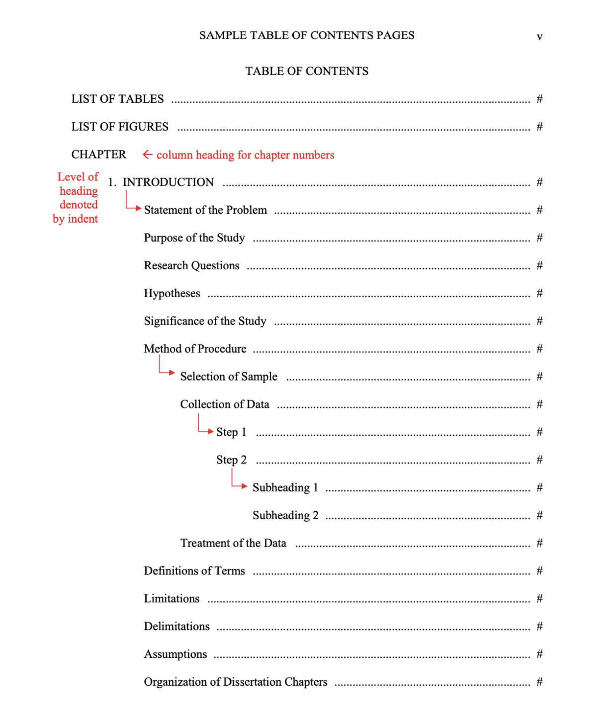 - Preliminary pages do not have to be included in the TOC; however, if included, begin with the Abstract page, and include all the preliminary pages that follow