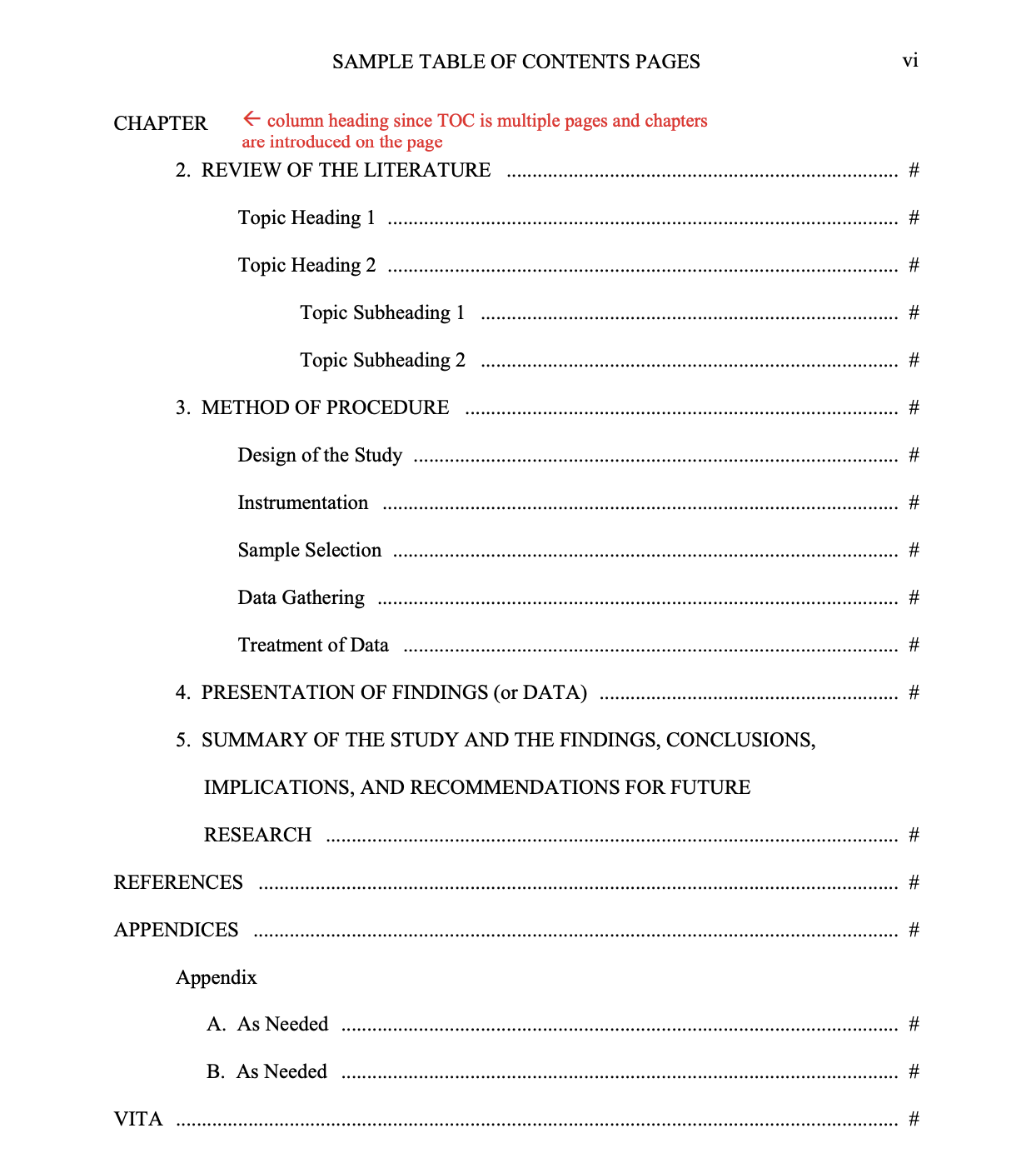 - If your TOC is more than one page, on each page that introduces a new chapter, include the word CHAPTER in the upper left corner of the page as a column heading (see sample page).