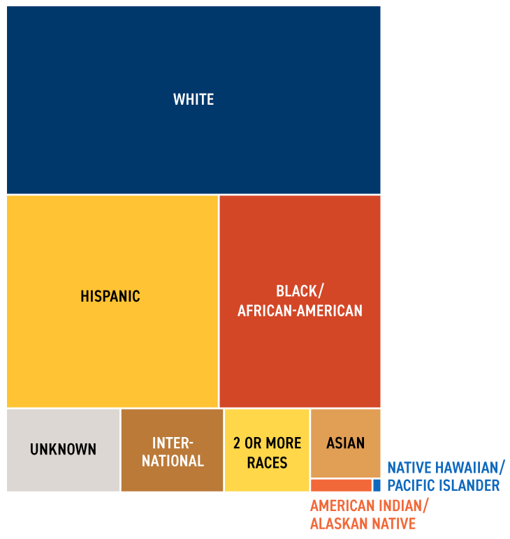 - 61% of students identify with racial/ethnical backgrounds other than White, including Hispanic (24.5%), Black or African American (19.1%), and other underrepresented groups.