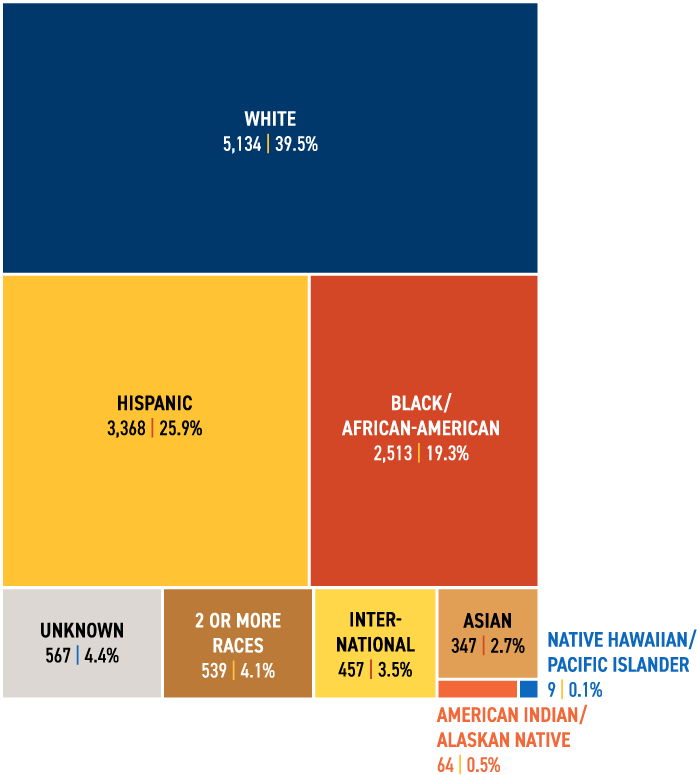 - 60% of students identified with racial/ethnical backgrounds other than White, including Hispanic (25.9%), Black or African American (19.3%), and other underrepresented groups.